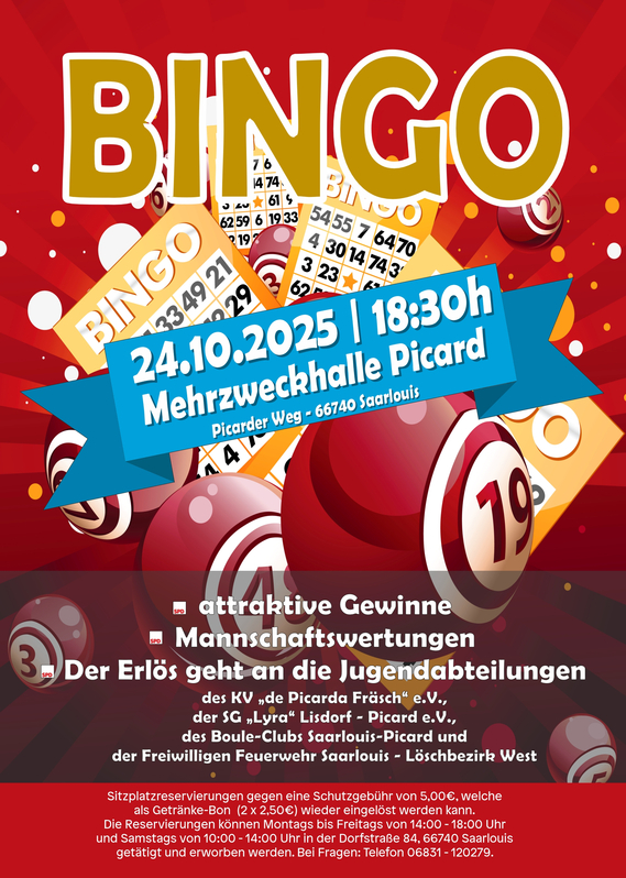 Der Vorverkauf für unseren Bingo Abend ist gestartet!!! Sitzplatzreservierungen werden gegen eine Schutzgebühr von 5,00€, welche als Getränke-Bon (2 x 2,50€) wieder eingelöst werden können, vergeben. Die Reservierungen können Montags bis Freitags von 14:00 - 18:00 Uhr und Samstags von 10:00 - 14:00 Uhr in der Dorfstraße 84, 66740 Saarlouis getätigt und erworben werden. Bei Fragen: Telefon 06831 - 120279.